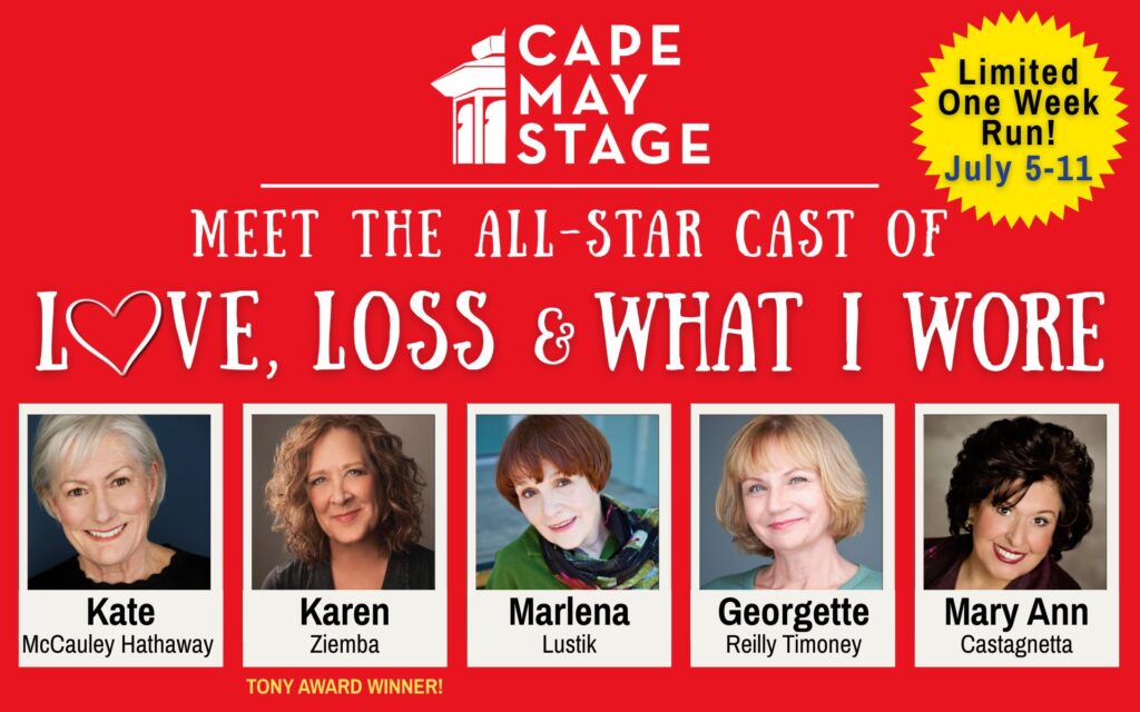 Love, Loss, and What I Wore is performed by an all-star ensemble featuring a powerhouse cast of stage veterans and Cape May favorites: Kate McCauley Hathaway, Karen Ziemba, Marlena Lustik, Georgette Reilly Timoney, and Mary Ann Castagnetta.